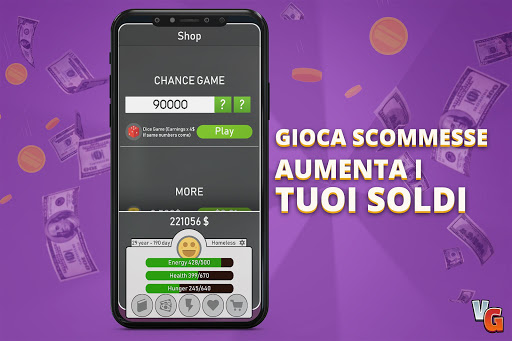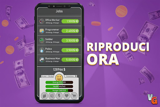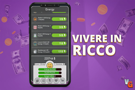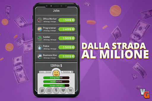 💲 Inizia per strada e raggiungi i milionari. 💲 Puoi migliorare te stesso acquistando istruzione e lavorando in condizioni migliori. 💲 Puoi comprare case e yacht di lusso raccogliendo denaro.