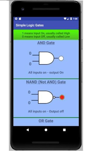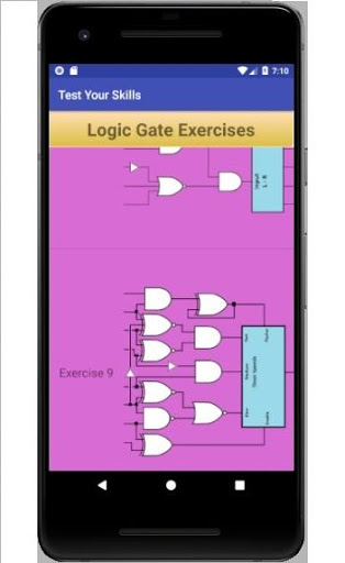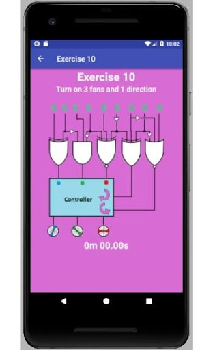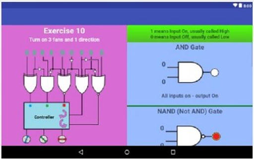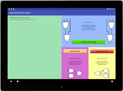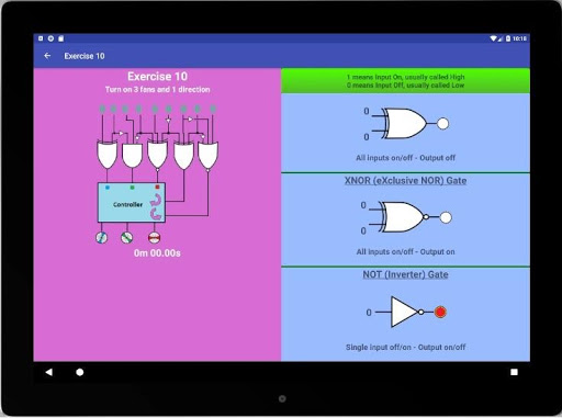 The landing screen links settings, gate introduction, exercise selection and fast times list. Settings gives a choice of touch sounds. Gate Introduction allows you to learn and understand the patterns of the seven logic gates that comprise all the exercises. The inputs can be changed to show how the output behaves. The Fast Times list will hold the three fastest times for each exercise. The Exercise Selection displays the ten exercises from which one can be chosen to complete. The exercises range from easy to hard. The desired outcome for each exercise is written at the top of the exercisec screen. The exercise timer will start when the first input is changed and stop when the desired outcome is reached. If a fast time is achieved, you can tap on the name indicator that has appeared. Write your name on the keyboard and enter. Your name and time will be written in the Fast Times list.