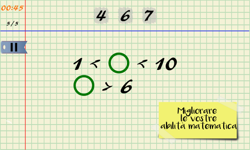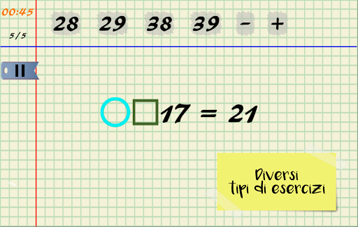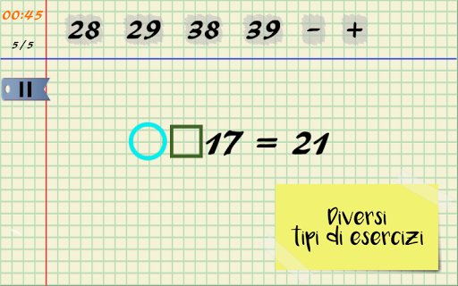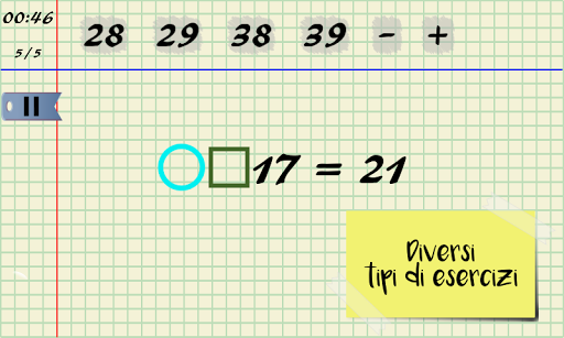 Un esercizio di matematica è dipendente dal tempo; inoltre vi è un numero fisso di mosse. Questi due sono variabili, a seconda della difficoltà di ciascuna equazione.