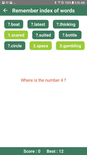 The first game: Remember the position of the words displayed on the screen, these words will change positions after 6 seconds, then you need to remember and choose the exact location of the words.