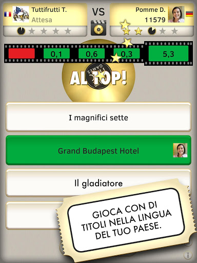 Scegli la lingua del gioco e/o la traduzione dei titolidi film.Giocherai con i titolidi film adattati allalingua del tuo Paese.*
