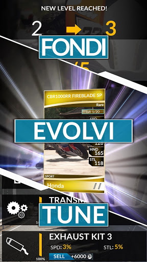 • Metti a punto le tue carte. Installa nuovi scarichi, sospensioni, gomme ed altri pezzi meccanici per costruire la moto definitiva. Fondi le carte per avanzare di livello.