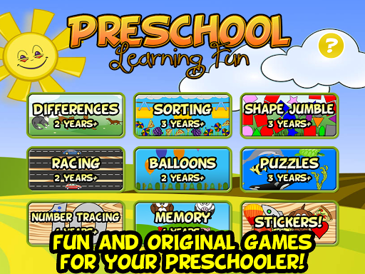 8 giochi divertenti e originali per aiutare il tuo studente in età prescolare ad imparare le abilità di base! Tieni il tuo bambino in età prescolare intrattenere mentre imparano smistamento, forme, colori, differenze, numeri, memoria e altro ancora! Adoderanno giocare ai giochi da corsa e palloncini e adorerai il fatto che stanno imparando e divertiti allo stesso tempo.