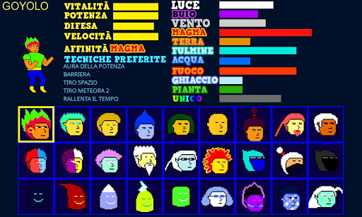 Nel videogioco Proiettile di Combattente puoi scegliere tra tanti personaggi unici con molte abilità, per combattere contro altri personaggi in una battaglia di proiettili. Proiettile di Combattente è come un gioco di combattimento, ma si usano soprattutto proiettili per determinare il risultato del match. I combattenti possono usare tanti elementi per i proiettili, inclusi luce, oscurità, vento, magma, terra, fulmine, acqua, fuoco, ghiaccio, piante e unico. Unico è applicato ai proiettili che non rientrano in altri tipi di elementi. Tutti gli elementi, ad eccezione di unico, hanno una debolezza (essi stessi sono deboli verso un altro elemento) e un opposto (un elemento che controbattono). Tutti i personaggi hanno un'affinità/un elemento che ne determina l'elemento più forte, elementi a cui essi resistono ed elementi che possono assorbire. I combattenti possono usare tecniche di base per attaccare, tirando proiettili in varie direzioni (verso l'alto in orizzontale o in diagonale verso il basso saltano) e possono difendersi, deviando o scansando i proiettili, saltandoci sopra e/o assorbendoli. I combattenti possono anche usare tantissime tecniche speciali per attaccare. Tutti i personaggi sono in grado di usare qualsiasi tecnica, ma sono più portati a usare le loro tecniche preferite. Leggi la guida presente nel gioco, per avere maggiori informazioni sulla meccanica, sulle tecniche e sulla terminologia associata al gioco. Proiettile di Combattente include musica e una lista di 7 tracce. I vari tipi di proiettile includono l'energia della luce, il vortice oscuro, il tornado, il legno (pianta), energia ki, diamante, raggio di energia, raggio oculare, onda d'urto, shuriken, energia e vortice del crepuscolo, stelle. I vari tipi di personaggi includono personaggi normali, androidi, maghi, spadaccini, ninja, ibridi, alieni e divinità. Ci sono diversi tipi di scenari che consistono in... Luminoso: cielo, sole splendente e nuvole. Scuro: una città di notte con grattacieli e una luna piena o crescente. Ventoso: un prato e un tornado fortissimo. Magma: un vulcano pieno di lava che erutta costantemente. La terra: un'area rocciosa con grandi montagne. Fulmini: pioggia e fulmini. Acqua: uno scenario con una cascata. Fuoco - fiamme blue. Ghiaccio: neve con suolo, montagne e pini ghiacciati. Piante - una foresta verde piena d'erba e alberi. Unico - spazio aperto, arcobaleno, corpi celesti, pianeti, un buco nero, la luna, il sole e tante stelle. Proiettile di Combattente è un gioco difficile che richiede buoni riflessi, reazione, pazienza e attenzione per vincere.