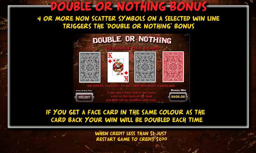 4 o più simboli normale (cioè non Scatter o simboli Bonus) di fila fa scattare il bonus Double or Nothing. È possibile mantenere le tue vincite o provare il raddoppio fino a, ma con il massimo o X16 il rischio di perdere tutto.