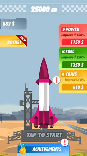 Aggiorna il tuo razzo per raggiungere nuovi obiettivi.Puoi migliorare la forza del razzo, il carburante e la capacità di raccogliere monete quando sei offline.