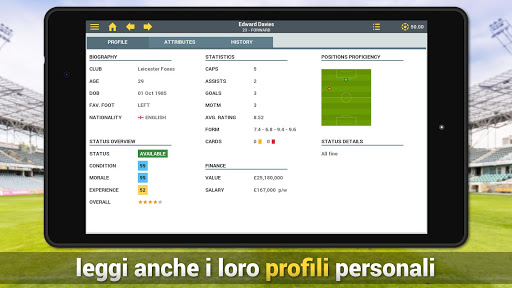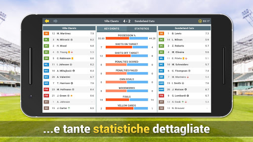 Un intero universo virtuale è simulato sul tuo dispositivo e puoi esplorarlo in dettaglio a partire dalle formazioni dei club ad arrivare alla storia dei loro giocatori.