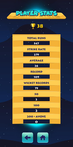 Puoi vedere le tue statistiche presonali in qualsiasi momento inclusa la corsa totale, la media, la frequenza di svolta, il record più alto, il più alto record di wicket singolo, totale 50s, totale 100s ecc.
