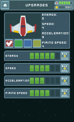 You can use the coins you get to upgrade your spaceship and make it stronger and faster. There are four areas you can upgrade, energy, speed, accelaration, and firing speed. Each area starts at level one and can be upgraded up to a maximum of level six.