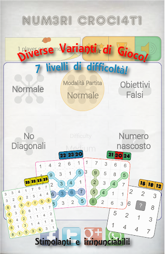 "Numeri Crociati" è un nuovo gioco-rompicapo. Assomiglia un po’ a Trova le Parole, considerato che dovrai trovare numeri nascosti in una tabella, sebbene, invece che parole, appariranno delle somme. Ed assomiglia un po’ al Sudoku, ma invece di applicare la logica per risolvere il puzzle, dovrai applicare delle semplici regole matematiche. Dovrai fare le somme velocemente, dovrai fare le somme corrette, potrai aver bisogno della tua intuizione così da concentrare la ricerca nelle parti giuste della griglia e ti divertirai molto, sviluppando allo stesso tempo il tuo cervello. Questo gioco migliora davvero il modo in cui puoi fare le somme veloci nella tua vita quotidiana.
