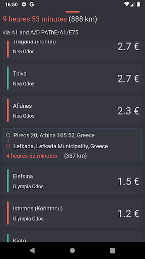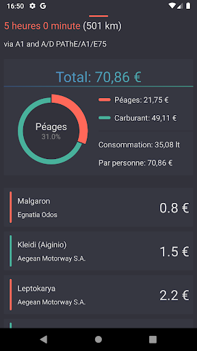 L'applicazione è completamente aggiornata e identifica tutte le stazioni di pedaggio previste in un determinato percorso in Grecia, dove calcola anche il costo del carburante per tutte le categorie di veicoli e motocicli del viaggio, fornendo dati di viaggio ricchi, significativi e aggiornati dove puoi salvare, modificare e condividere.