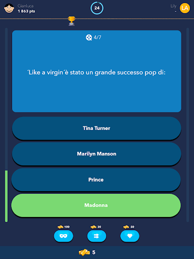 Metti alla prova le tue conoscenze generali o gioca nella tua categoria preferita: geografia, intrattenimento, storia, arte e letteratura, scienza e natura, sport, musica, film e calcio! Decidi tu!