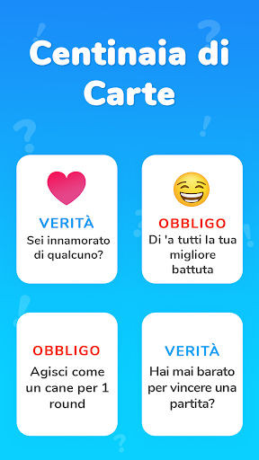 Conosci i tuoi amici giocando a Obbligo o Verità! È perfetto per feste, appuntamenti, pigiama party o semplicemente per rompere il ghiaccio. Ti darà sicuramente un'incredibile quantità di divertimento!