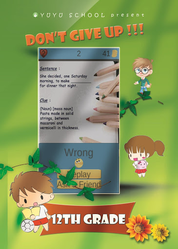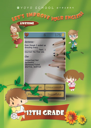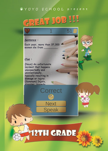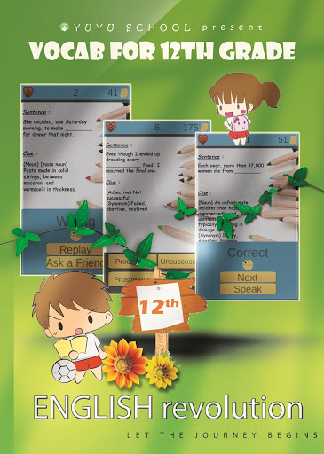 Vocabulary Games Inglese è un gioco educativo pensato per il 12 ° grado per espandere il vocabolario inglese attraverso l'officina vocabolario come giochi di ortografia, test inglese e frasi inglesi in esercizi di inglese con immagini. Ogni esercitazione inglese migliorerà la sua difficoltà basata sul livello inglese. I Giochi del Vocabolario per il 12 ° ti danno alcuni elenchi di vocaboli per iniziare. Le lezioni di inglese interattive con l'immagine sono efficaci per la prova in inglese e in inglese. Giocando i nostri giochi gratuiti a parole e quiz, i ragazzi possono migliorare il loro vocabolario inglese e le grammatiche inglesi.