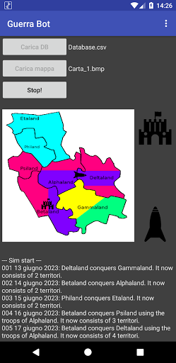 Ad ogni iterazione, un territorio viene scelto casualmente; se è occupato, può ribellarsi e ottenere l'indipendenza con una probabilità configurabile, altrimenti lo stato non alleato con baricentro più vicino viene scelto come difensore e una normale battaglia viene condotta; i due hanno una probabilità di vincere proporzionale alla rispettiva potenza.