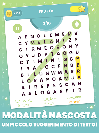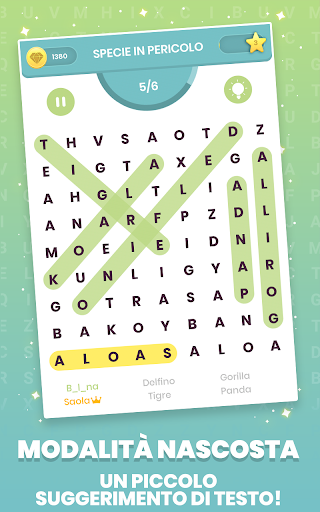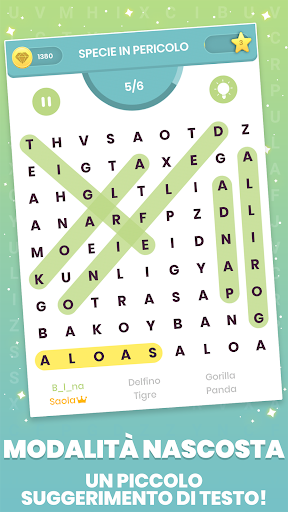 Lettere nascoste: qui ti diamo una lista di parole, ma ogni parola ha lettere nascoste che rendono la ricerca un po 'più impegnativa. Fantastico per i giocatori avanzati!