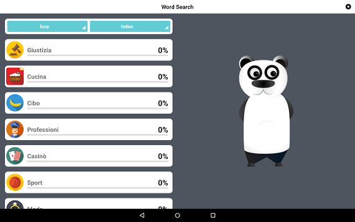 La caccia alle parole intrecciate italiano è appena cominciata. Scorri tutte le parole nascoste e sblocca un badge in ogni livello. Disponibile in 7 lingue: inglese (Word Search Panda), portoghese (Caça palavras Panda),