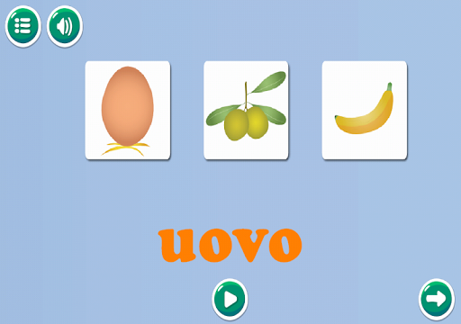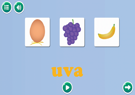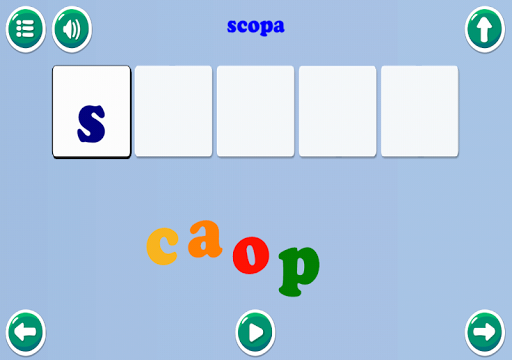 Al primo livello il bambino dovrà posizionare le lettere della parola nella posizione corretta trascinando le lettere al posto giusto. Completando con successo il compito apparirà l'immagine corrispondente alla parola.
