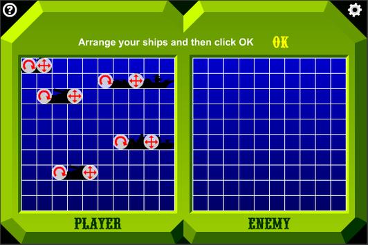 Purge your enemy's naval forces and assert your authority in the sea! Your goal in this game is to sink the opponent's battleships by using torpedoes strategically. When the game starts, your 5 vessels will be placed in the area at the left-hand side, while those of the enemy are on the right. You can arrange the positions of your ships so that they will not be easily located by your rival. You may click the cross button on the right of a ship and drag the ship to a desired location, or click the reverse button on the left of the ship to place it upright. When you are satisfied with your arrangement, click the OK button on the top right of the play areas to begin the game, but bear in mind that your fleet can no longer be moved during the game process. You and the computer will then take turns to bomb each other's warships. The positions of your ships will be displayed to you, but those of the computer are not revealed. You need to deduce the precise locations of the enemy ships according to the directions of their attacks, then click a square in the enemy's play area to shoot. When a torpedo successfully hits an enemy craft, a part of the craft will be on fire. If the bomb misses, a water drop label will appear on the target, indicating the absence of enemy vessels. When all battleships of a side are hit and sunk, the game ends. Declare your victory by launching accurate attacks!