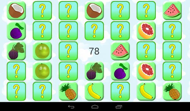 In the Match game, you must correctly select two matching fruit tiles from a whole bunch of tiles. The earlier you find a match, the more points you get! When you match all the fruit, you finish the game. Can you get a gold star and beat your high score?