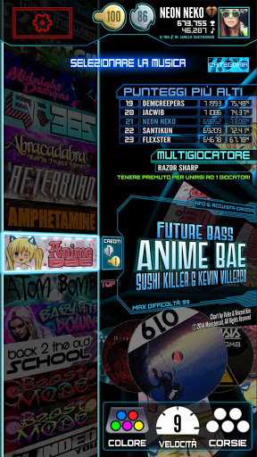 Come il gioco arcade originale, molte opzioni di difficoltà per ogni canzone permettono ai giocatori di tutti i livelli da giocare e competere. Gioca una nuova selezione di musica gratis ogni settimana. Mantieni il ritmo per guadagnare punti, guadagnare distintivi, sbloccare nuove canzoni, e vincere gettoni per giocare giochi gratuiti. I giochi arcade e cellulari ricevono gli aggiornamenti di canzoni ogni due settimane o meno, assicurando si sta giocando la più nuova musica e mantenendo la concorrenza fresca! Vieni a vedere perché NeonFM ™ è il miglior gioco musicale del decennio!