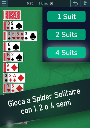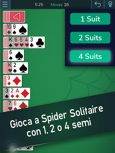Puoi giocare gratis a Spider Solitaire e scegliere di fare una partita con quattro, due o un seme. Goditi ora uno dei migliori giochi di carte di tutti i tempi.