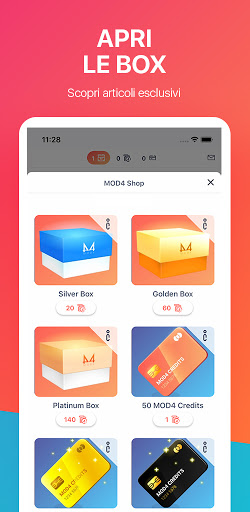 Apri 4 tipi di Box, una più favolosa dell’altra. Trova gli articoli con il MOD level più raro, arricchisci il tuo Guardaroba e scopri se hai avuto la fortuna di aggiudicarti gli articoli più cool che puoi trovare su MOD4!