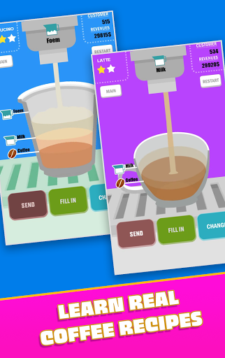 Cappuccino, Macchiato, Latte, Americano, Flat White, Espresso. You can learn real coffee recipes when play.