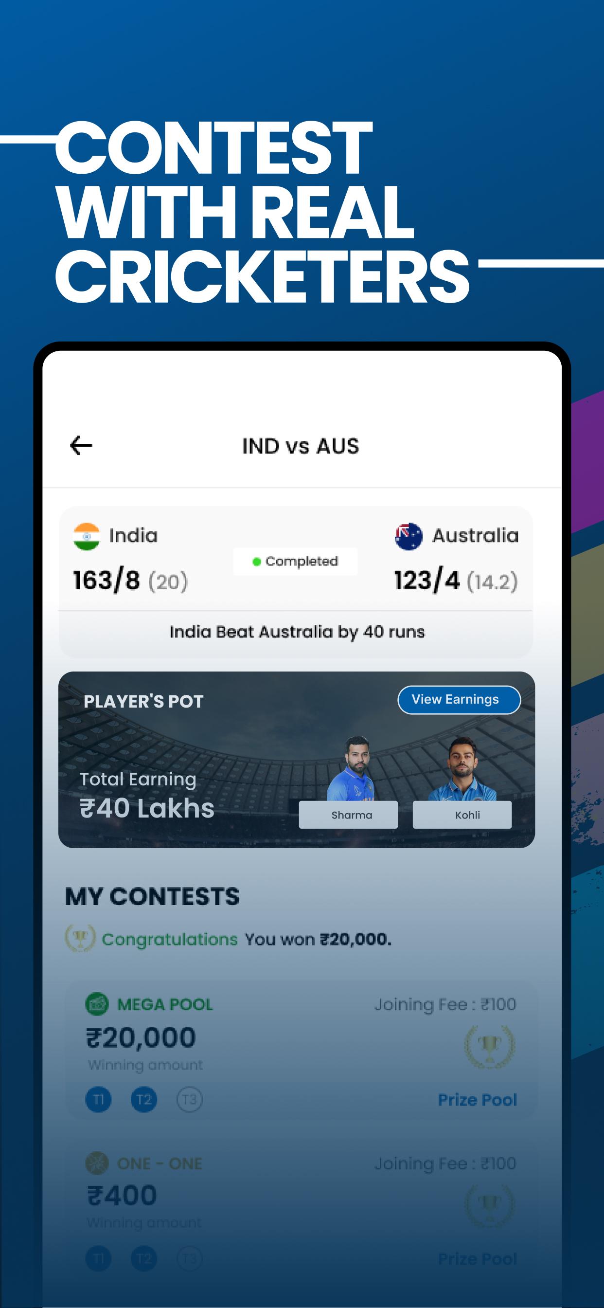 Fantasy cricket app is a strategy-based online cricket sports game where players create a virtual team of cricketers playing in real cricket matches. You earn points based on the performances of these players in actual cricket matches. You must pick your best dream team of 11 cricketers from the teams playing on a given day. Assign a Captain (2X points) and a Vice-Captain (1.5X points) carefully as they will earn you maximum points. Join the public contests or compete with your friends in private groups. You earn points as per your team’s real-life performance. Score maximum points on the leaderboard to win cash prizes .