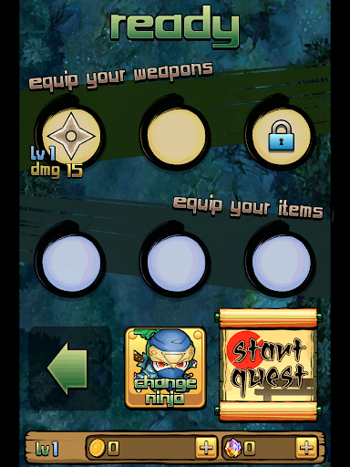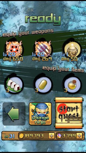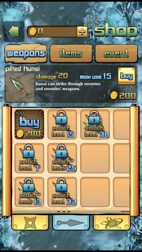 - Weapon: numerous kinds of shuriken (ninja star), kunai, bomb that are all upgradable