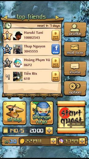 - Facebook: when you get to higher level and possess more powerful weapons, it worths to save your data just in case you lose your phone or accidentally clear game data. Facebook connecting allows you to share your high score as well as to invite your friends just by a simple tap and receive more rewards.