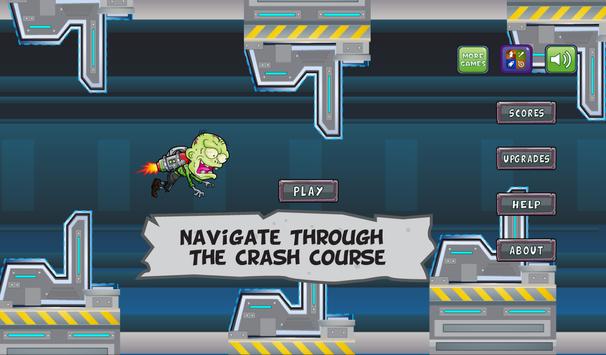 The gameplay is to navigate the zombie through the crash test course without running into any objects or walls. A witty and strange zombie crawler’s companion character is strapped to a jetpack. Hold down the screen to soar and travel your zombie with his jetpack. Go up, go down as long as you don’t collide into big walls and objects that may interfere with your speed or else may blew up your jetpack with real fatality sound.