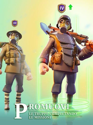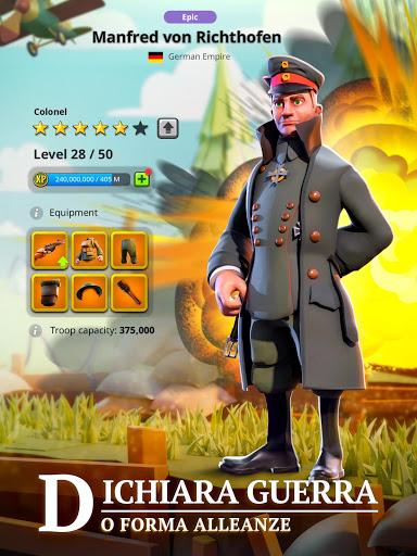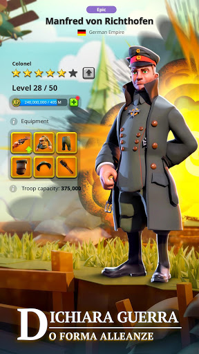 Crea un esercito, dota il tuo eroe di un equipaggiamento militare invincibile e dimostra la tua supremazia sul campo di battaglia. Usa equipaggiamenti della Prima Guerra Mondiale, appartenenti all'esercito inglese, tedesco, russo, austro-ungarico, ottomano, francese o statunitense.
