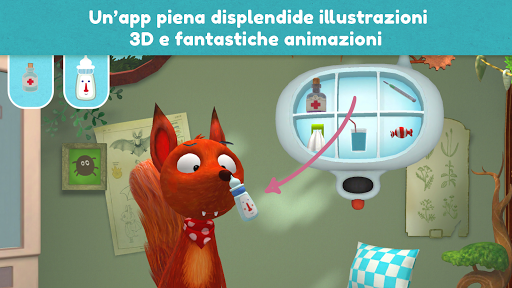 L’app è piena di animazioni divertenti, straordinarie illustrazioni in 3D e piccoli filmati buffissimi. Nell’ambulatorio del dottore, in una magica casa sull’albero, gli animali attendono di essere visitati. I bambini, in un’atmosfera giocosa, sono invitati ad applicare gli stessi trattamenti che possono aver ricevuto in prima persona: misurazione della fabbre, somministrazione di medicine e applicazione di cerotti. Ovviamente, uno spuntino a base di chiocciole è apprezzato solo dai gufi!