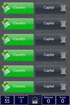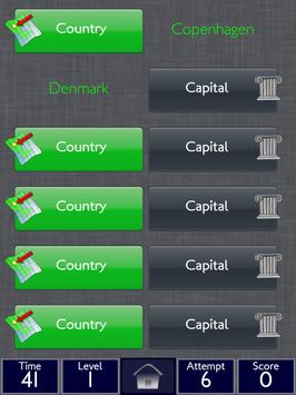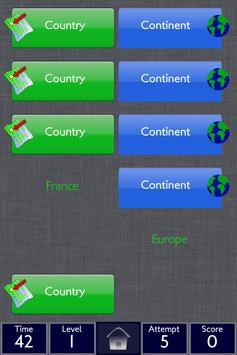 An addictive memory game that helps you learn geography while you play and beat your previous high scores. Match the entries on each section and match them before time runs out. If you get it wrong, remember what you saw, because the next time you want to match, your good memory will be rewarded. Remember, as you crack the levels, they get tougher... and interesting.