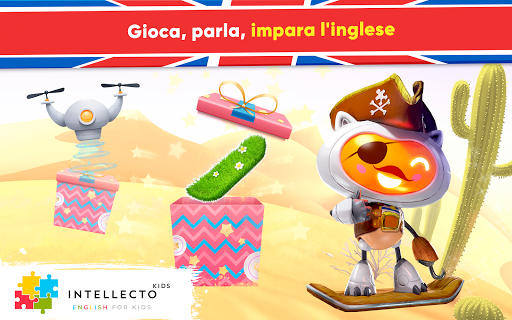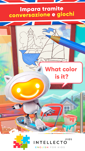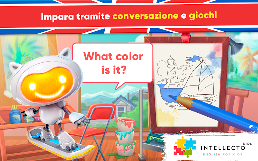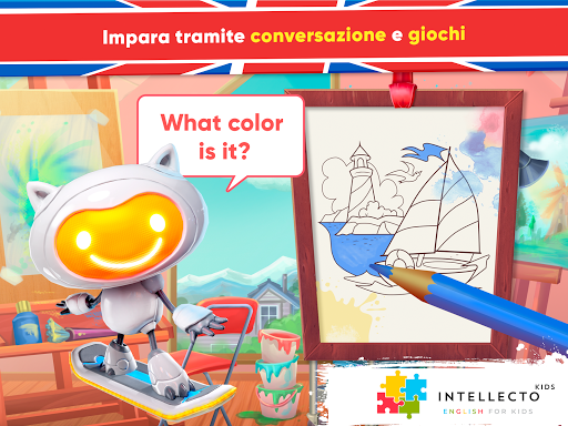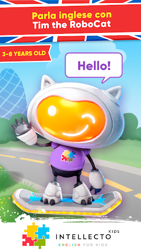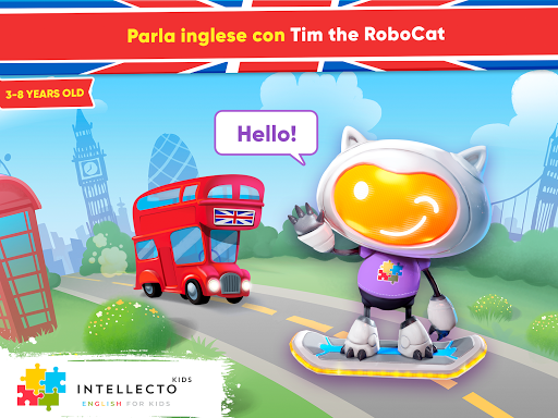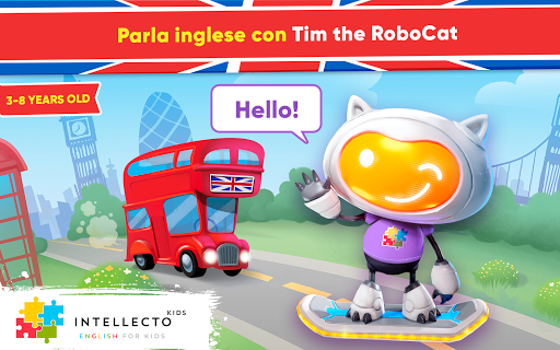 L'Inglese per bambini di IntellectoKids aiuta i bambini di età compresa tra 3 e 8 anni A IMPARARE L'INGLESE in modo divertente e interattivo! Come farlo con l'aiuto di un insegnante dal vivo, Tim the RoboCat, un adorabile personaggio basato sull'intelligenza artificiale, insegnerà la lingua inglese a tuo figlio attraverso conversazioni situazionali comuni e mini giochi educativi.