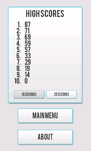 Check your own highscores for both the 10 second and 20 second mode achieved in singleplayer to look back at your best 10 attempts from the past.