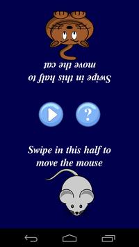 Exciting new two player game where two players play on the same device by swiping on different parts of the screen. One player plays the cat and the other plays the mouse. The players swipe on the respective half of the screen to move the cat and the mouse.