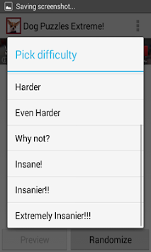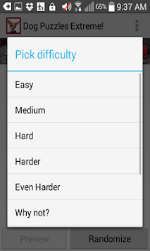 Easy, Medium, Hard, Harder, Even Harder, Why not?, Insane!, Insanier!!, and Extremely Insanier!!! And has 3 wonderful dog pictures to choose from.