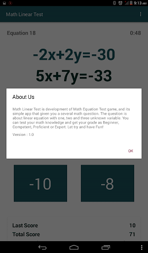 that suitable with the equation. And the score that you can get is represent to you how far your knowledge about math linear equation with one, two or three unknown variable. Let try our math game. And have fun!
