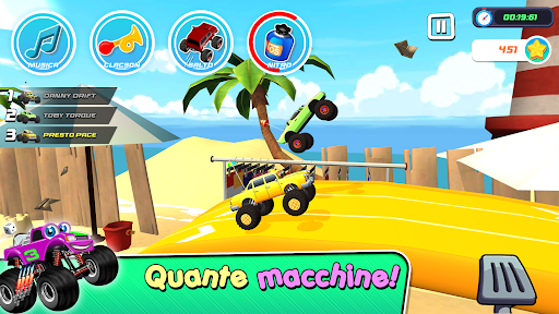 Divertenti pulsanti colorati per saltare, suonare il clacson e cambiare la traccia musicale o attivare il nitro per accelerare davanti alle altre auto. Sblocca nuove antenne e ruote per spingere ancora di più il tuo monster truck.