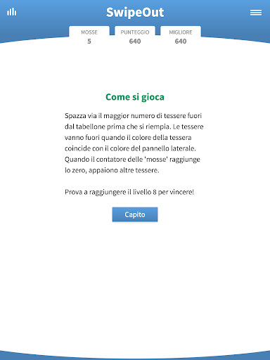 L'obiettivo è quello di cacciar fuori dal tabellone più tessere colorate possibile. Puoi cacciar via le tessere colorate solo se il colore coincide con quello del pannello laterale colorato. Quando il contatore raggiunge lo zero, compaiono altre tessere, quindi, presta attenzione e usa mosse strategiche. Ogni volta che si spazza fuori dal tabellone una tessera, i punti salgono. Più alto è il punteggio, più diventa difficile! Affina la tua strategia e continua a giocare il più a lungo possibile per aumentare e massimizzare il tuo punteggio. Prova a raggiungere il livello 8 per vincere!