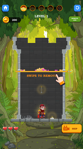 The hero begins his journey for treasure and save princess, but the puzzles in front of the hunter trapped him. What you need to do is to pull the pins in the right order, so that the hero can take the hidden treasure and save princess away from dragon, wolf and monster safely.