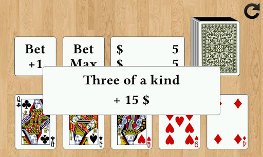 A single player Poker game, similar to Video Poker (9/6 Jacks or Better). Bet some (virtual) money, hold some cards, and try to get the highest poker hand. Free, with an ad banner.