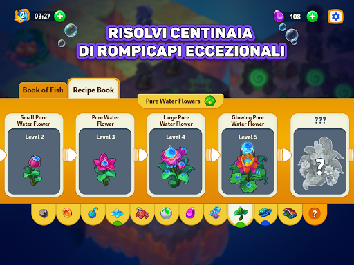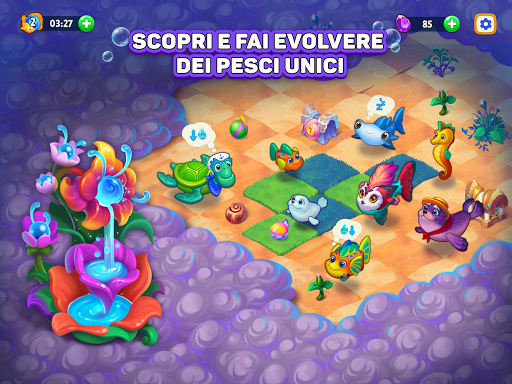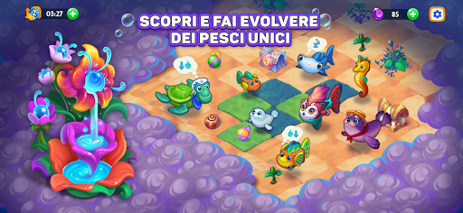 Inizia a far evolvere gli elementi per ripulire il fondale del mare e sbloccare nuovi livelli divertenti e entusiasmanti. Divertiti a contemplare le rilassanti decorazioni dell'acquario. Pensa le tue mosse in anticipo, cambia l'aspetto del fondale e fai evolvere i tuoi amici pinnati. Metti l'oceano intero nella tua boccia per pesci!