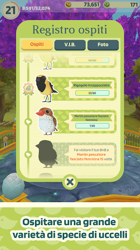 - Questo gioco include anche l'opzione di realtà aumentata! Se vuoi vivere un momento magico di connessione con i tuoi amici uccellini, passa alla modalità RA e li vedrai saltellare davanti a te, ovunque tu sia! Perché non provare a scattare una foto del tuo uccellino accanto a un animale domestico? Scatta una foto nel salotto, sul tetto, al parco o davanti a un famoso monumento!