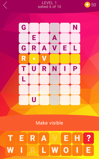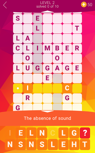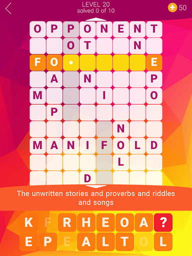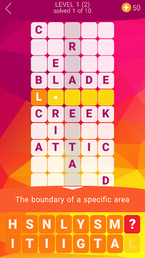 Refreshing crossword experience! Unlike in a typical crossword, words here are stacked on top of each other. Try to guess all words and solve all levels! Some answers are straightforward, some are quite tricky. This crossword game is an excellent workout for your brain cells!