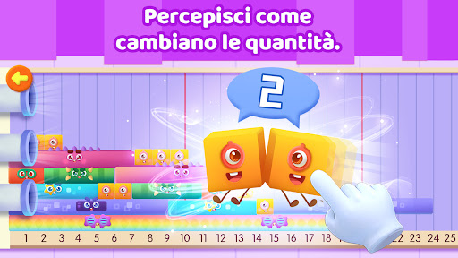 Quanti numeri ci sono tra il 2 e il 3? A quale quantità corrisponde il numero 100? Vieni a divertirti con le quantità. Potrai capire il cambiamento delle quantità impilando i mattoncini. Come possiamo confrontare i numeri? Confrontando la lunghezza dei diversi gruppi di mattoncini!