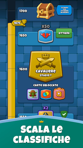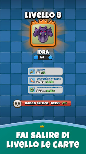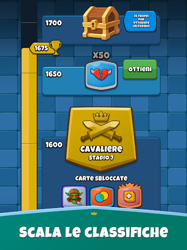 Scontrati con boss epici e i loro tirapiedi a difesa del tuo regno. Colleziona potenti eroi e abilità speciali per costruire il mazzo di battaglia definitivo e conquistare la vittoria mentre competi con giocatori di tutto il mondo. Man mano che vinci, sbloccherai nuovi stadi salendo di grado e guadagnerai più forzieri, oro e trofei!
