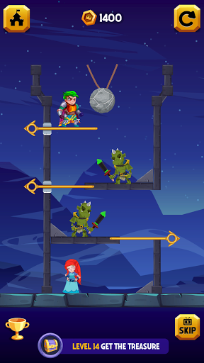 Let's start the journey for treasure and to save the princess, There are multiple challenging puzzles where you just have to pull the right pin in right order, so your hero can get the hidden treasure coins and save the princess successfully from the monster enemies.